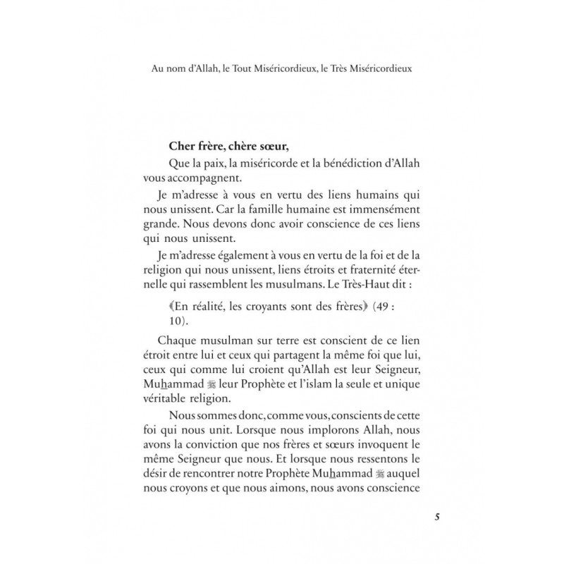 À mes frères et sœurs : Message pour une vie meilleure – Al Bayyinah : « Ce modeste ouvrage renferme certains enseignements salutaires qui permettront à celui qui les connaît de comprendre le sens de la vie et à celui qui s’interroge sur le sens de son existence de cesser d’errer sans but sur terre. Quiconque lit cet ouvrage verra en effet le chemin s’éclairer devant lui et saura quelle mission lui a été confiée sur terre. Lui seront également dévoilés certains des secrets de l’au-delà et lui sera décrite la vie éternelle.