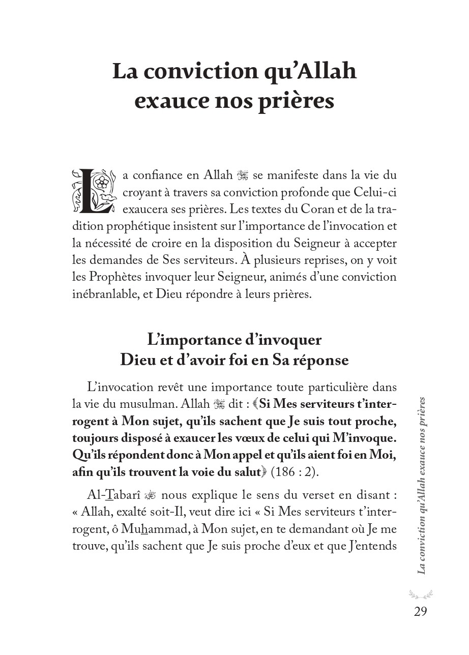 Sans elle, nous ne saurions apprécier le message divin et le laisser nous guider. C’est notre confiance en la parole du Messager r et en l’intégrité de ceux qui nous l’ont rapportée qui nous permet d’œuvrer et de nous y conformer. Autrement, comment expliquer l’attachement à tant de préceptes, si ce n’est que nous savons qu’il s’agit de la vérité ?