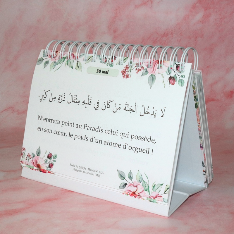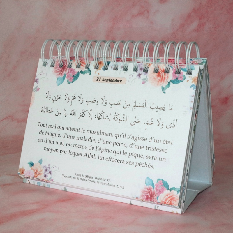 Calendrier Un hadith chaque jour – 365 sagesses prophétiques – Bilingue (Arabe-Français) : Un hadith chaque jour est un magnifique calendrier éducatif joliment illustré qui, comme son nom l’indique, comprend 365 hadiths, à raison d’un hadith authentique par jour, soit une année entière emplie de spiritualité à la lumière des nobles paroles du meilleur des hommes Muhammad (SAW). Chaque hadith – transcrit dans les deux langues : arabe (vocalisé) et français – est rattaché à ses sources, son ou ses rapporteurs et aux numéros qui lui sont attribués dans les éminents recueils de hadiths.