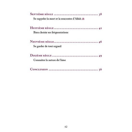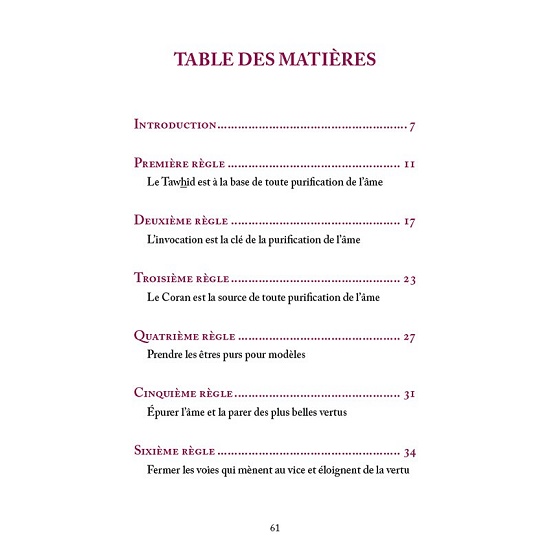 Dix règles d’or pour purifier son âme : Il incombe à chaque musulman qui aspire au bien et au salut d’accorder une attention toute particulière à la purification de son âme et de s’évertuer, chaque jour de son existence, d’atteindre ce noble but, afin d’obtenir le bonheur véritable ici-bas et la félicité éternelle dans l’au-delà. En effet, le musulman a des devoirs envers son âme, comme le Prophète (SAW) l’a affirmé : « Tu as des devoirs envers ton âme. »