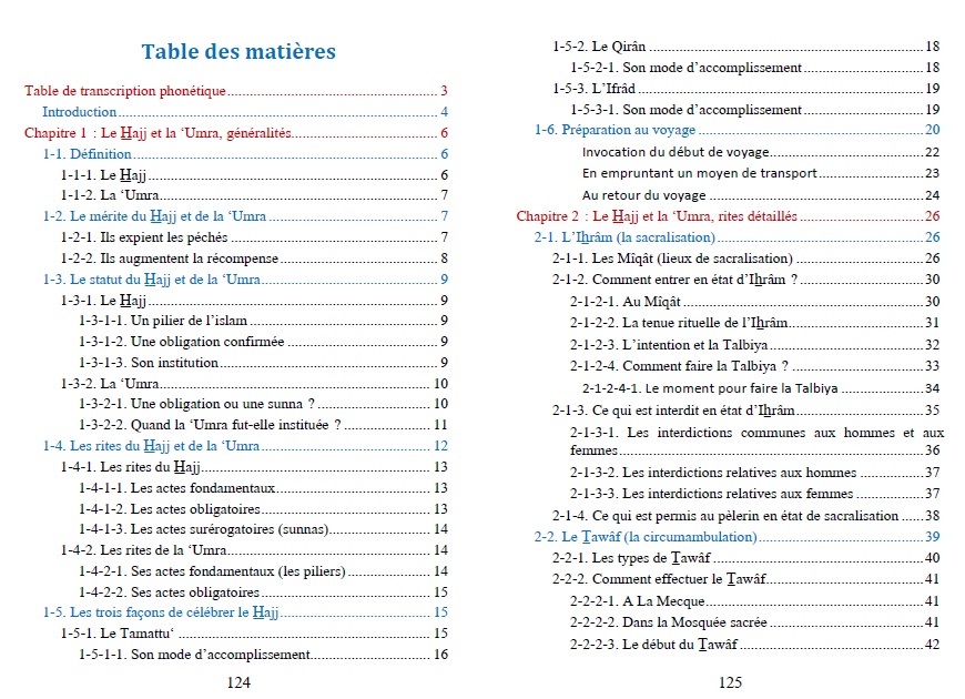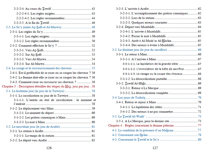 - Les trois formes du Hajj : At-Tamattu‘, Al-Qirân et Al-Ifrâd.