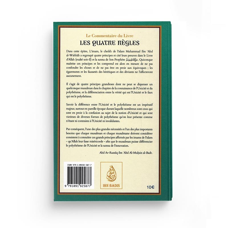 Le commentaire du livre Les quatre règles- Par Abd Ar-Razzâq Abd Al Muhsin Al Badr – Ibn Badis : Dans cette épître, L’imam, le cheikh de l’islam Muhammad Ibn ‘Abd al-Wahhâb a regroupé quatre principes et cité leurs preuves dans le Livre d’Allah (exalté soit-Il) et la sunna de Son Prophète . Quiconque maîtrise ces principes et les comprend est alors en mesure de ne pas confondre les choses et de ne pas être en proie aux équivoques ; les égarements et les faussetés des hérétiques et des déviants ne l’affecteront aucunement.