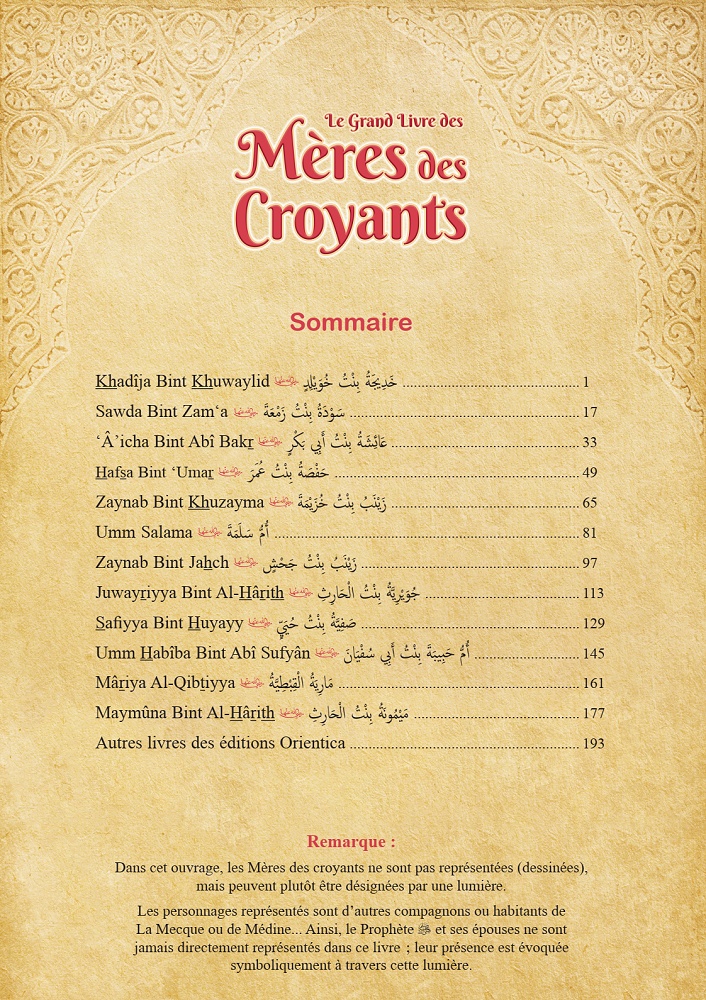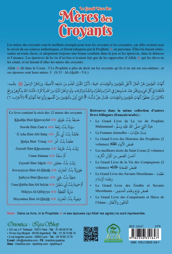 Le Grand Livre des Mères des Croyants (Les épouses du prophète) – Bilingue Français-Arabe : Les mères des croyants sont le meilleur exemple pour tous les croyants et les croyantes, car elles avaient reçu le savoir de ses sources authentiques, et furent éduquées par le Prophète ﷺ en personne. Elles lui étaient obéissantes en toute chose, et adoptaient toujours une bonne conduite dans la joie et les épreuves, dans la détresse et l’aisance. Les épreuves de la vie d’ici-bas n’avaient fait que de les rapprocher d’Allah qui les éleva en les citant, et en faisant d’elles les mères des croyants.
