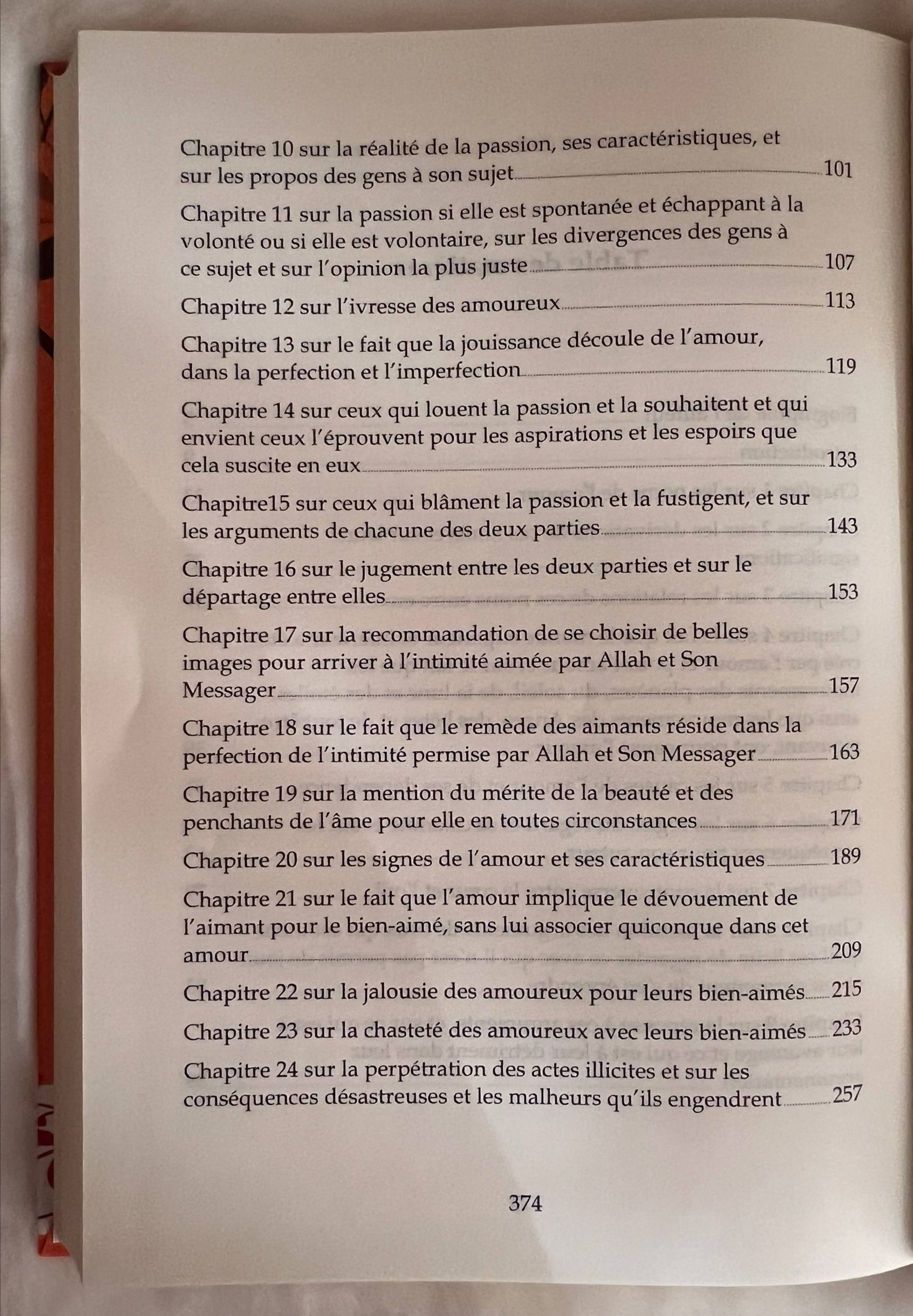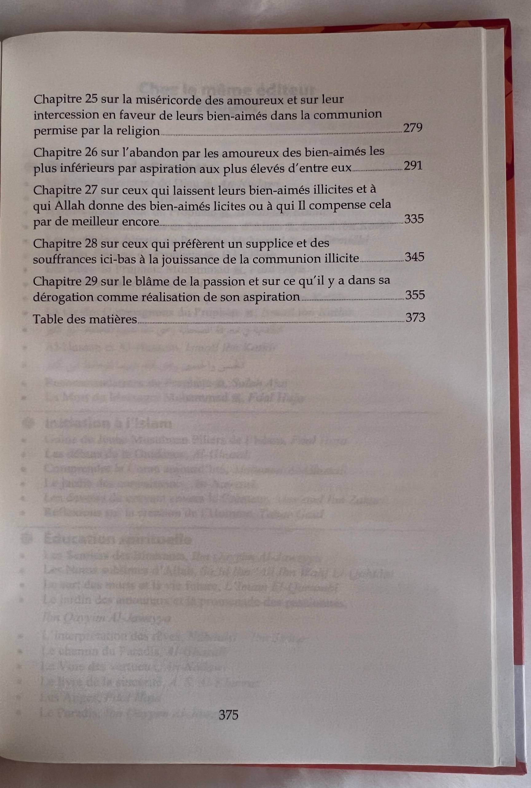 Le jardin des amoureux et la promenade des passionnés, ce livre vise à faire connaître le mérite de l’amour chaste et le rang privilégié que possèdent les amoureux auprès d’Allah. Il montre le décalage qui existe entre l’amour au sens noble et désintéressé du terme, et la passion sensuelle et charnelle qui entraîne au péchés et à la désobéissance.