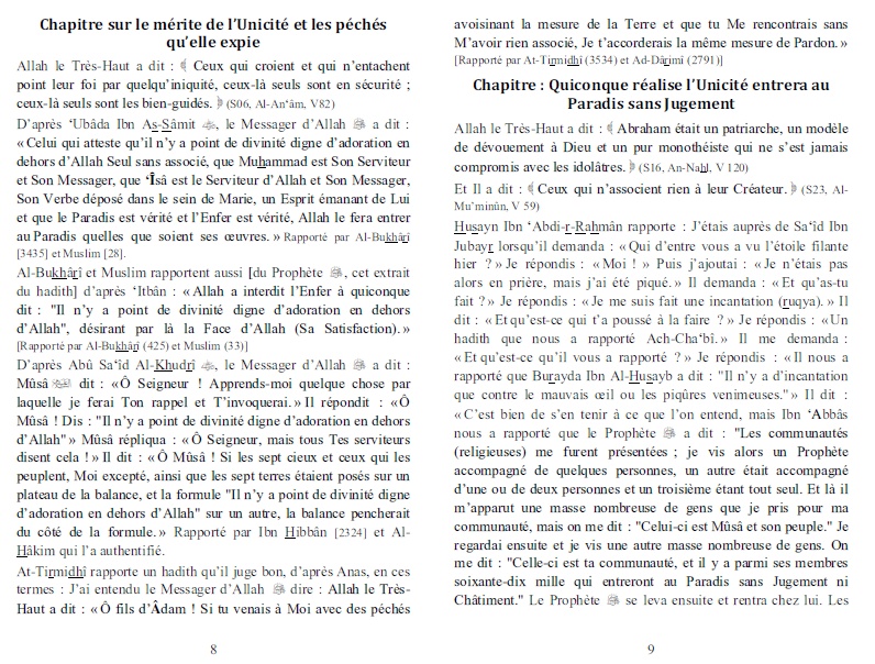 Ce livre traite donc de l’Unicité divine, qui est le principe fondamental de l’Islam, le sens même de l’attestation de foi «Il n’y a point de divinité digne d’adoration en dehors d’Allah». Ce principe consiste à vouer à Allah un culte sincère et exclusif en rejetant toute forme de polythéisme (Chirk).