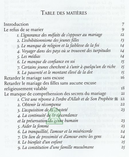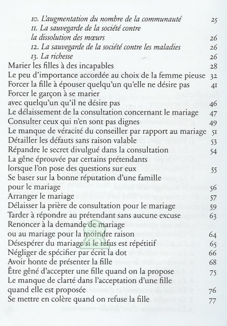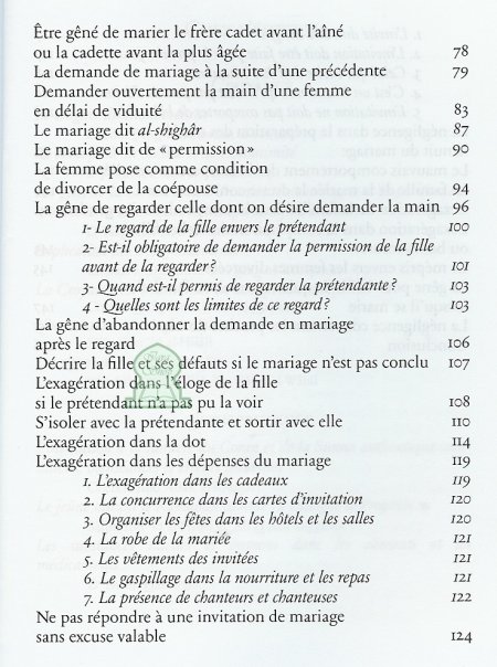 Le mariage un nouveau départ dans la vie : Ce livre a pour ambition d’exposer mais aussi de corriger les erreurs les plus souvent commises lors des démarches du prétendant, de la cérémonie du mariage te de la vie conjugale quotidienne. Pour que la vie de couple ne soit plus une routine ni un calvaire ou un passage obligé dans la vie du musulman, mais plutôt une voie vers le paradis et un moyen d’y accéder par la volonté d’Allah.