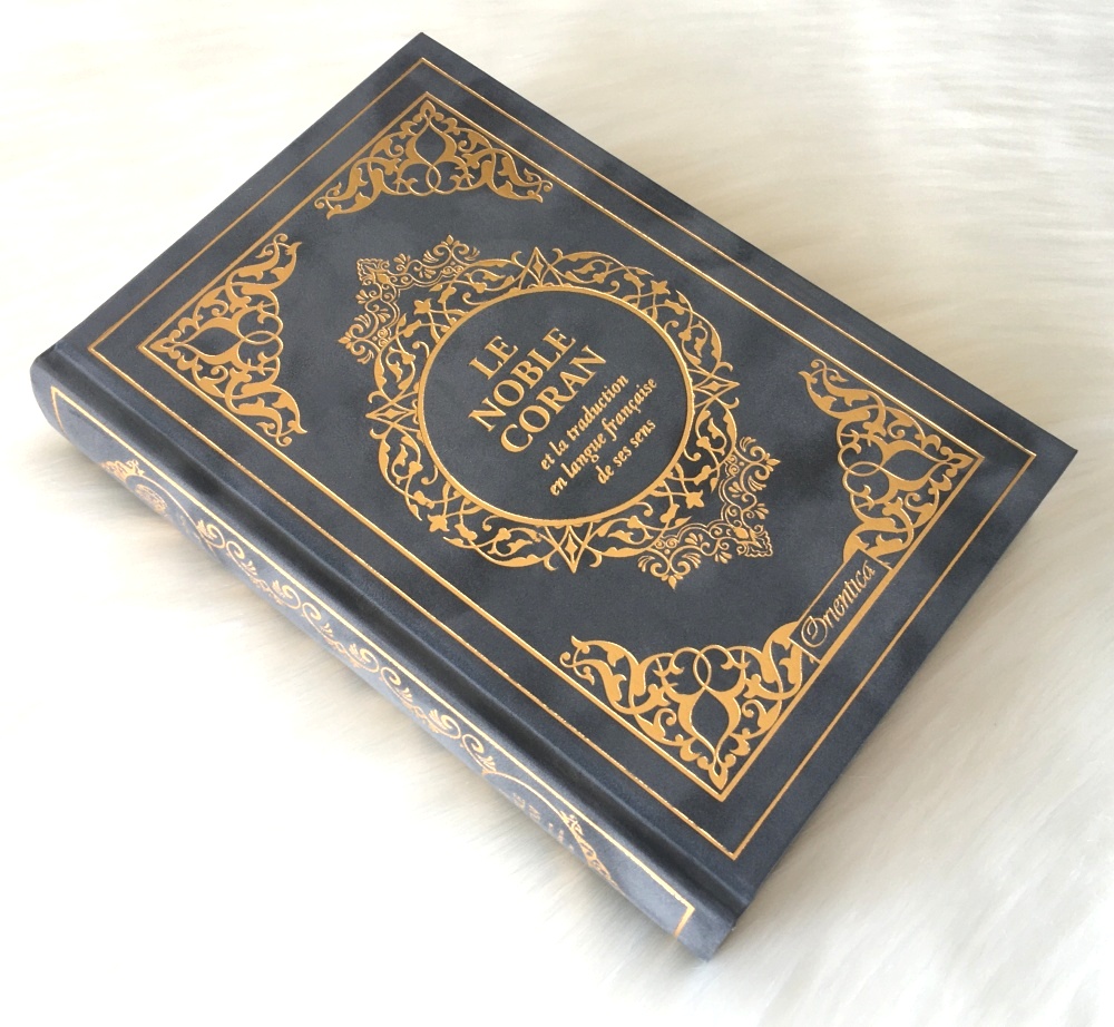 Le Noble Coran Bilingue Français Arabe – Couverture cartonnée en daim couleur Gris Anthracite doré
