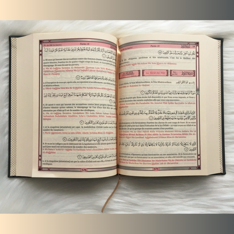 Le Saint Coran – Arabe-Français-Phonétique – Couleur noire : Le Saint Coran avec versets en arabe, traduction française + transcription phonétique (translittération de l’arabe en caractères latins). Impression couleur. Couverture en similicuir dorée, avec bords arrondis et marque page intégré. Contient la traduction française officielle du complexe du Roi Fahd – Arabie Saoudite.