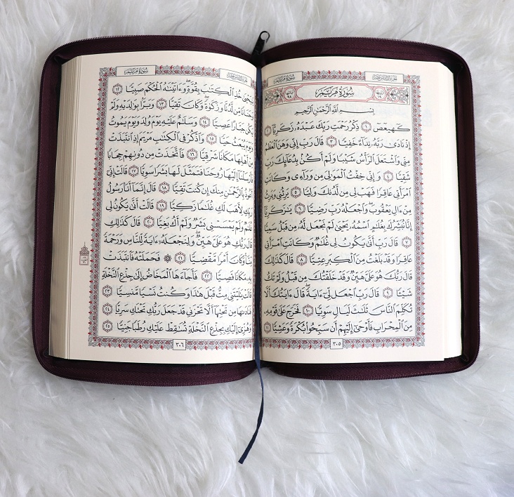 Le Saint Coran en langue arabe avec fermeture Zip – Format 14 x 20cm : Le Saint Coran transportable au format assez grand (14 x 20 cm) avec fermeture zip et couverture plastifiée pratique pour le prendre avec soit sans l’abîmer durant ses voyages et déplacements. Ce Coran est en lecture Hafs et en langue arabe uniquement. Avec marque page en tissu intégré. Sa taille permet une lecture très confortable du texte.