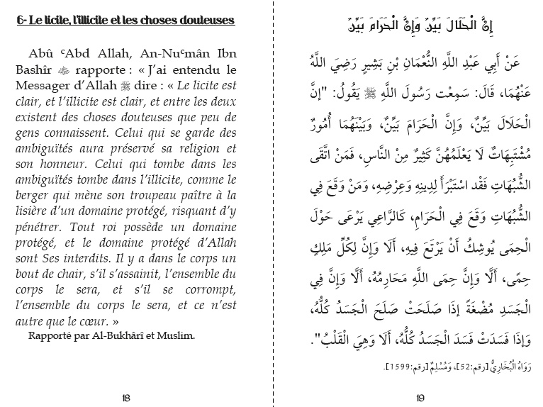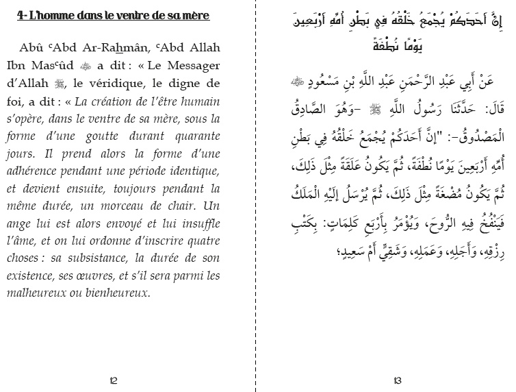 Ce livre comporte quarante-deux Hadiths, l’imam Nawawî y a réuni les points importants de la religion touchant aussi bien aux principes fondamentaux (al oussoûl) qu’aux applications pratiques (al fouroû’)