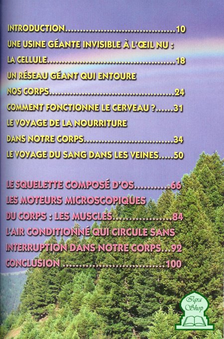 Ce livre vous amènera à réfléchir sur votre corps. Il vous fera découvrir de façon simple sa complexité et les miracles de sa constitution. Après l’avoir lu, vous aimerez Dieu avec plus d’intensité et vous Le remercierez davantage pour Ses bienfaits. Vous serez sans doute surpris de la négligence des gens autour de vous qui ne méditent pas sur les merveilles de notre corps. N’hésitez pas à alors à leur communiquer ce que vous avez appris afin de leur mettre en évidence l’existence de Dieu le Tout Puissant.