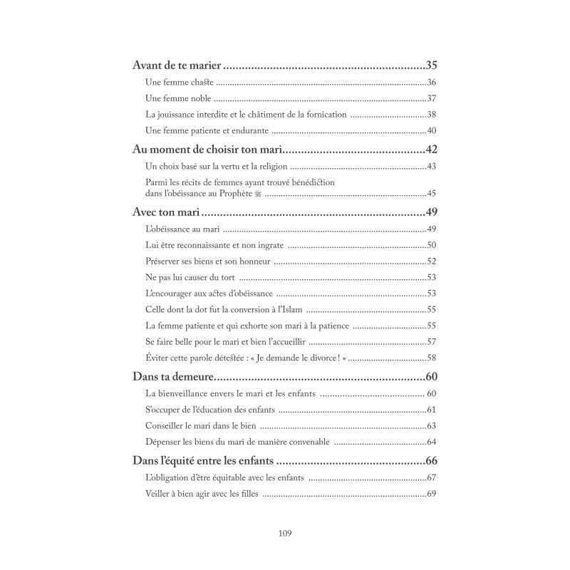 Ma soeur, voilà comment Allah et Son Messager veulent que tu sois ! Cet ouvrage est un rappel non sans intérêt pour les musulmanes vertueuses et les croyantes pieuses quand à l’attitude générale qu’elle doivent adopter. Il se distinguent de la plupart des écrits publiés à ce sujet par son côté pratique et ses nombreux conseils qui ne manqueront pas d’éclairer celles qui désirent améliorer leur vie quotidienne dans l’obéissance de leur Seigneur. La femme musulmane es certes le pilier sur lequel la famille musulmane est construite, elle est le champ de protection pour ce foyer et l’école pour les générations futures.