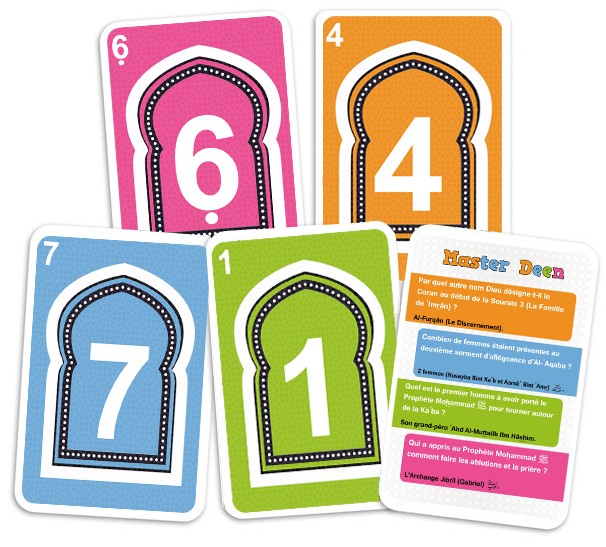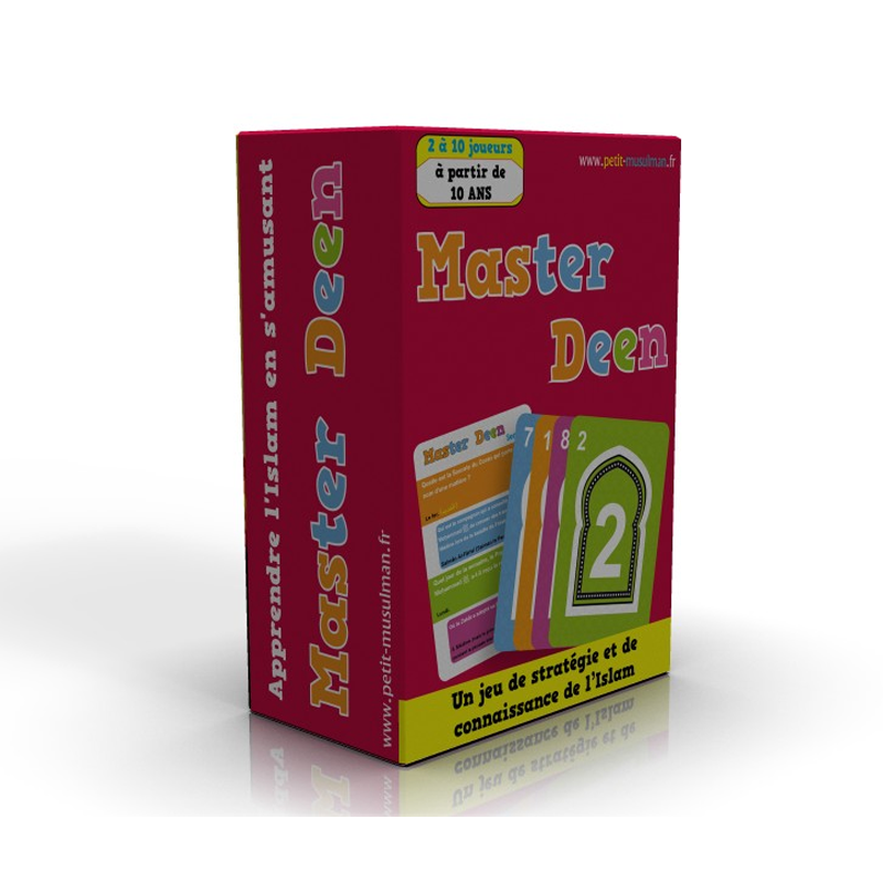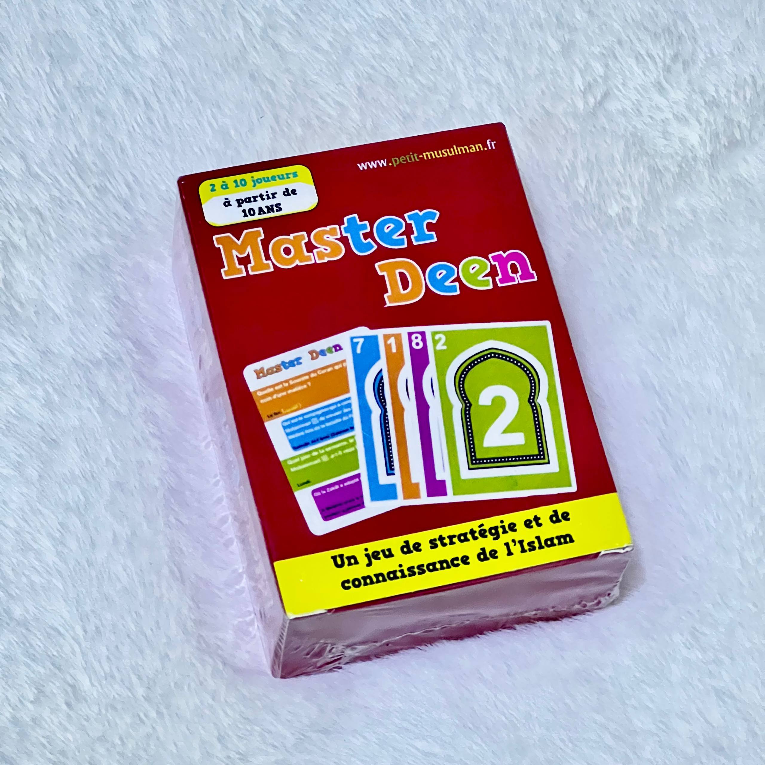 Master Deen : Jeu de stratégie et de connaissance de l’Islam. Il contient 110 cartes avec 120 questions : sur le Coran, les Prophètes, le Prophète Mohamed (PBSL), les piliers de l’islam et des questions générales sur l’Islam.