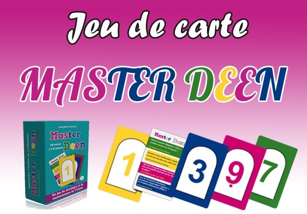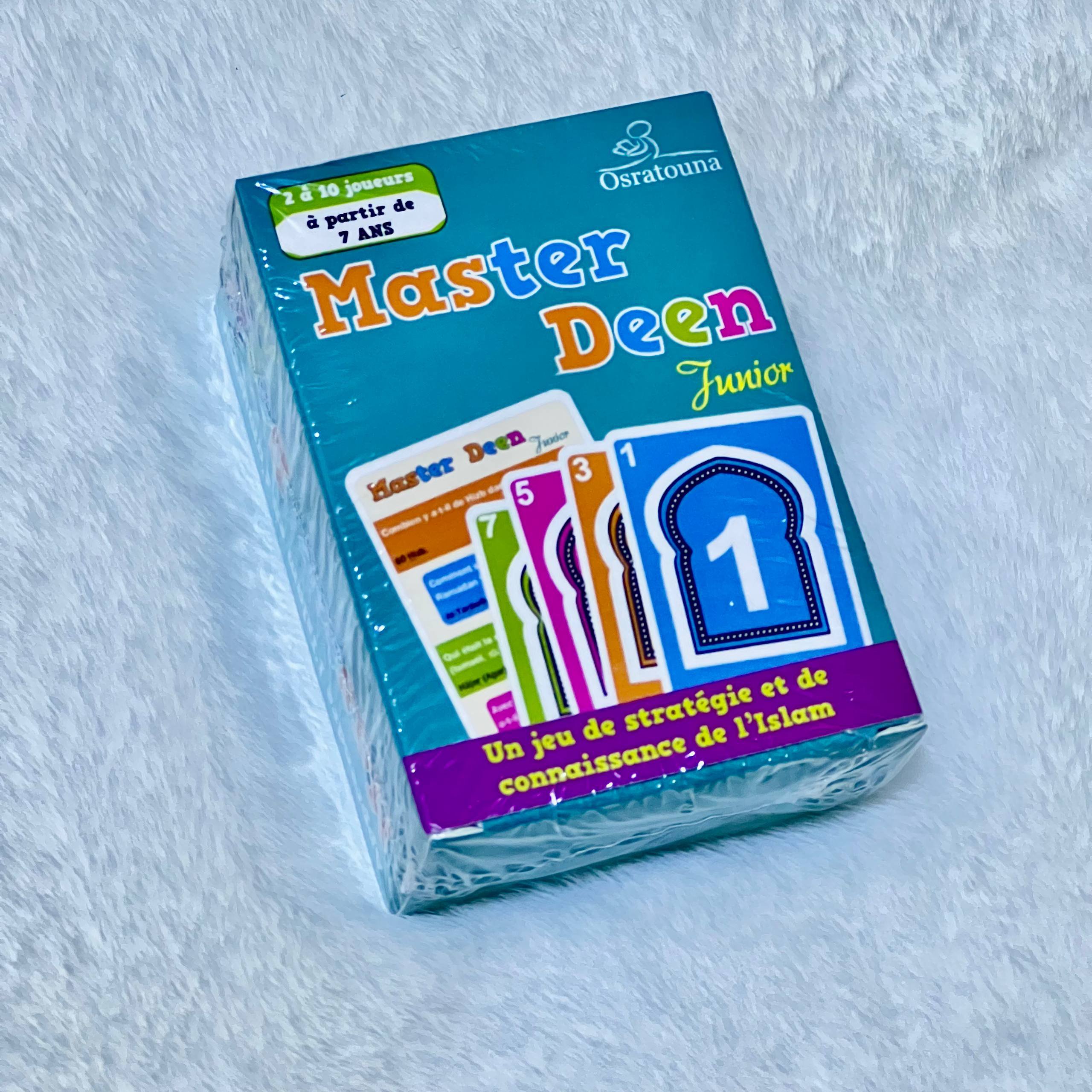 Master Deen Junior se veut un jeu de stratégie et de connaissance de l’Islam. Il contient 110 cartes avec 120 questions : sur le Coran, les Prophètes, le Prophète Mohamed (PBSL) et des questions générales sur l’Islam.