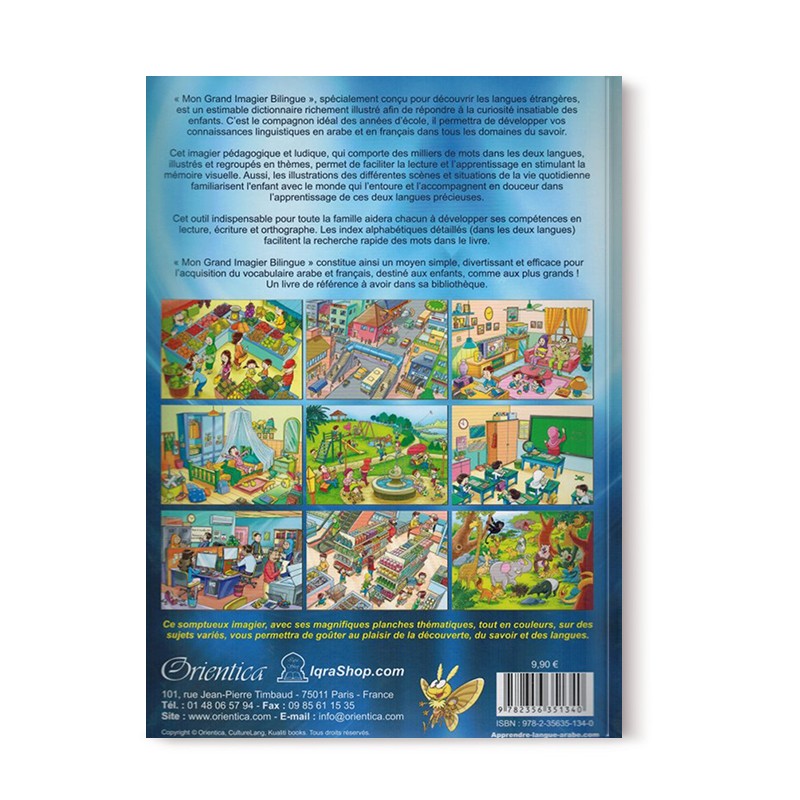 Mon Grand Imagier Bilingue (arabe-français) : « Mon Grand Imagier Bilingue », spécialement conçu pour découvrir les langues étrangères, est un estimable dictionnaire richement illustré afin de répondre à la curiosité insatiable des enfants. C’est le compagnon idéal des années d’école, il permettra de développer vos connaissances linguistiques en arabe et en français dans tous les domaines du savoir.