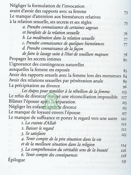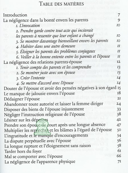 Nouveau départ avec mon épouse : ce livre a pour ambition d’exposer mais aussi de corriger les erreurs les plus souvent commises lors des démarches du prétendant, de la cérémonie du mariage te de la vie conjugale quotidienne. Pour que la vie de couple ne soit plus une routine ni un calvaire ou un passage obligé dans la vie du musulman, mais plutôt une voie vers le paradis et un moyen d’y accéder par la volonté d’Allah.