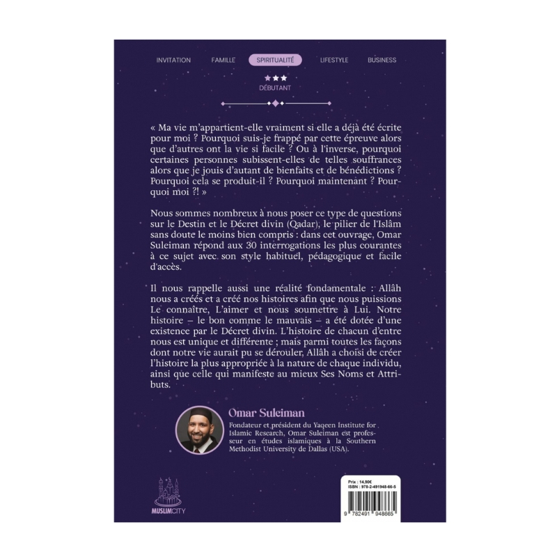 Nous sommes nombreux à nous poser ce type de questions sur le Destin et le Décret divin (Qadar), le pilier de l’Islâm sans doute le moins bien compris : dans cet ouvrage, Omar Suleiman répond aux 30 interrogations les plus courantes à ce sujet avec son style habituel, pédagogique et facile d’accès.