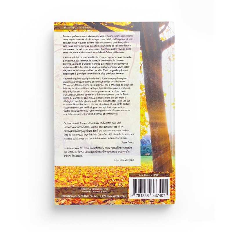 Renoue avec ton coeur- Yasmin MOGAHED : Beaucoup d’entre nous vivons nos vies enfermés dans un schéma dans lequel nous ne récoltons que cœur brisé et déception, et bien souvent nous n’avons aucune idée des raisons pour lesquelles cela nous arrive. Renoue avec ton cœur parle de la libération de notre cœur, de cet asservissement. Il raconte notre voyage dans cette vie, dont le chemin est semé d’embûches et illusions. Ce livre a été écrit pour éveiller le cœur, et apporter une nouvelle perspective sur l’amour, la perte, le bonheur et la douleur. Comme un mode d’emploi, Renoue avec ton cœur se propose de transmettre des clés de sagesse au lecteur pour vivre cette vie, sans se laisser posséder par elle. C’est un guide qui nous apprendra à protéger notre bien le plus précieux: le cœur.