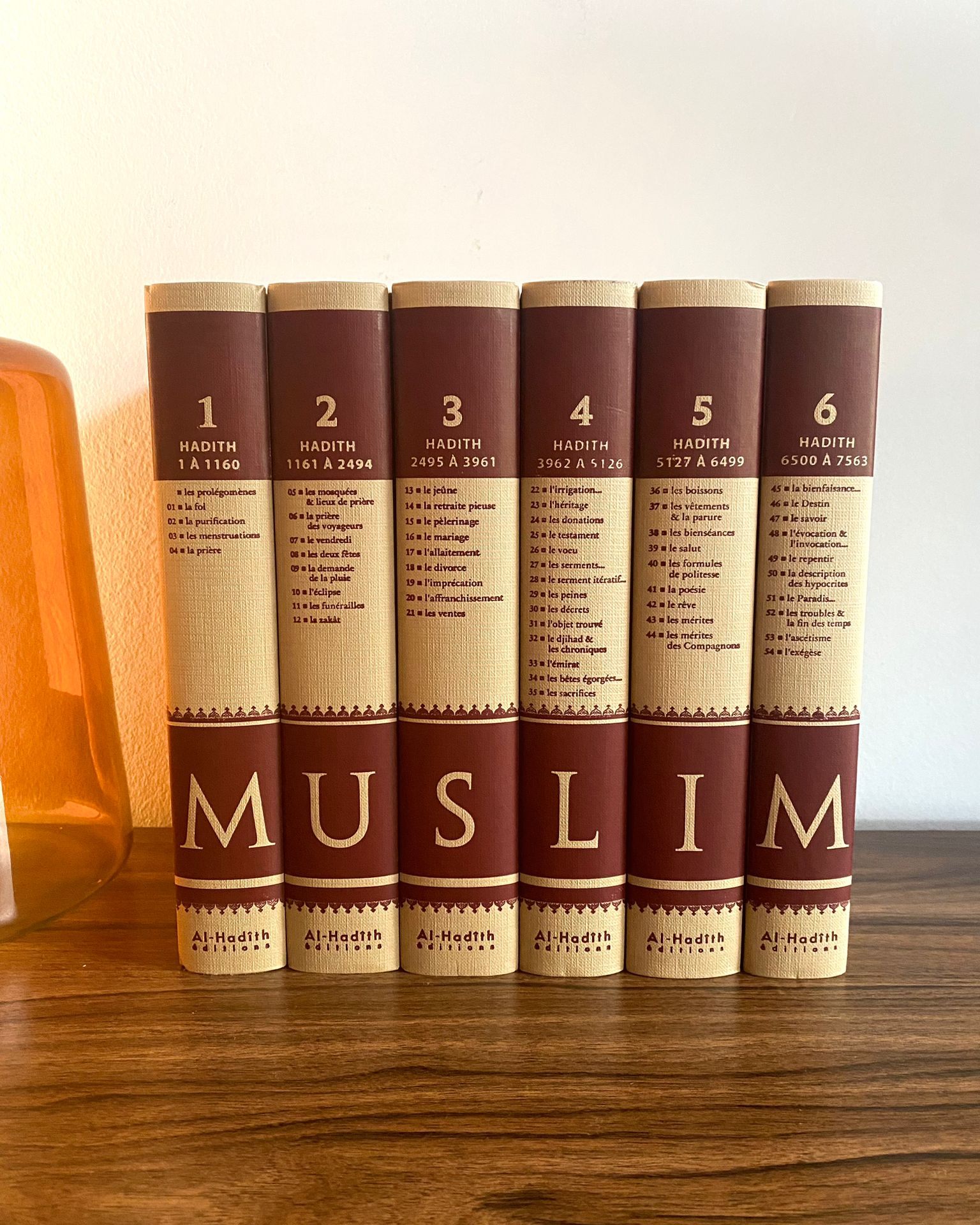 Sahih Muslim – Version intégrale 6 volumes – Imam Muslim – Editions al-Hadith : Il s’agit de la traduction intégrale du recueil de 7563 hadiths authentiques de l’Imam Muslim et de leurs chaînes de transmission. Une présentation soignée du français et de l’arabe vocalisé permet une lecture facile et plus compréhensible. Nous avons choisi de diviser notre ouvrage en six tomes et nous avons rajouté sur les tranches de chacun les chapitres auxquels il fait référence.